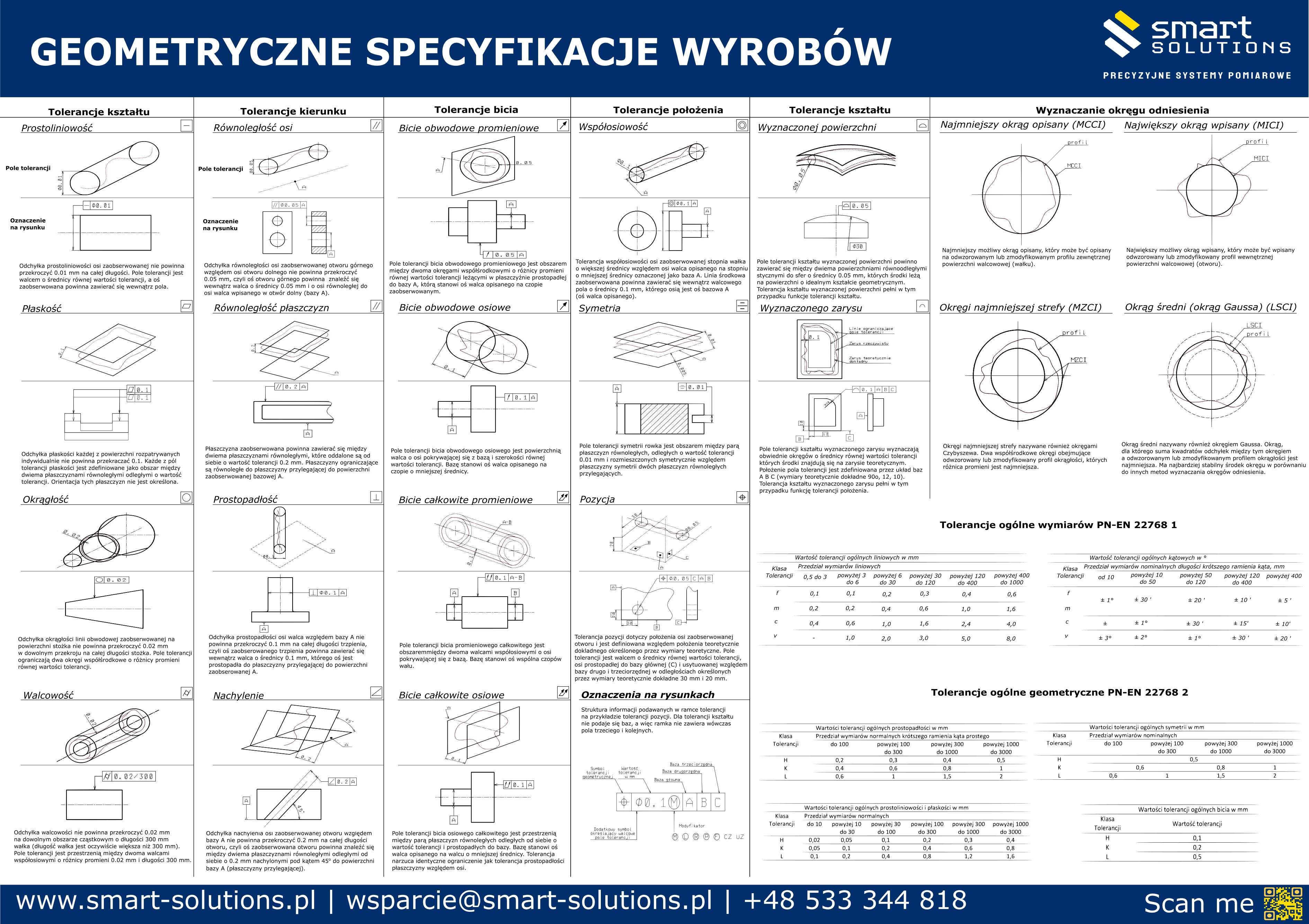 „Plakat metrologiczny – geometryczne specyfikacje wyrobów” to praktyczne narzędzie do interpretacji wszystkich tolerancji, kształtów i położenia (GD&T) pomocne w pracy przy pomiarach współrzędnościowych